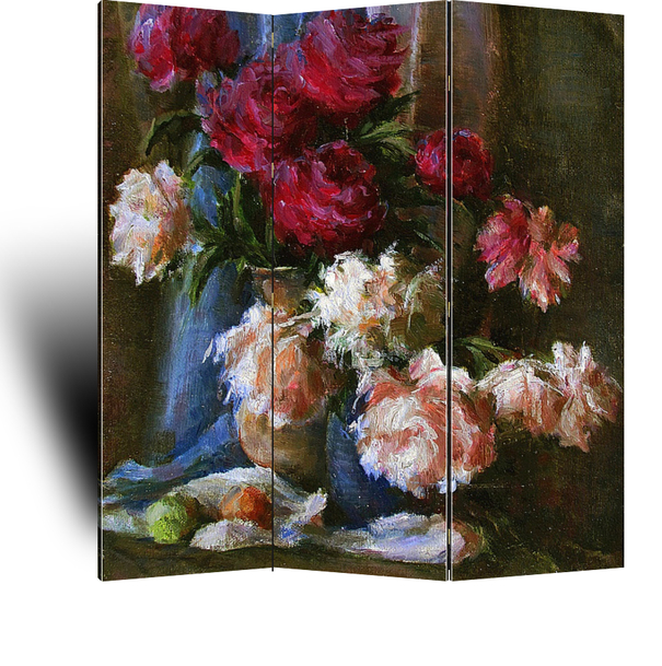 Описание ширмы Для создания этого натюрморта были использованы два букета пионов, один красных, другой кремовых, в разных цветочных горшках. Фон и стол украшены драпировками и фруктами.