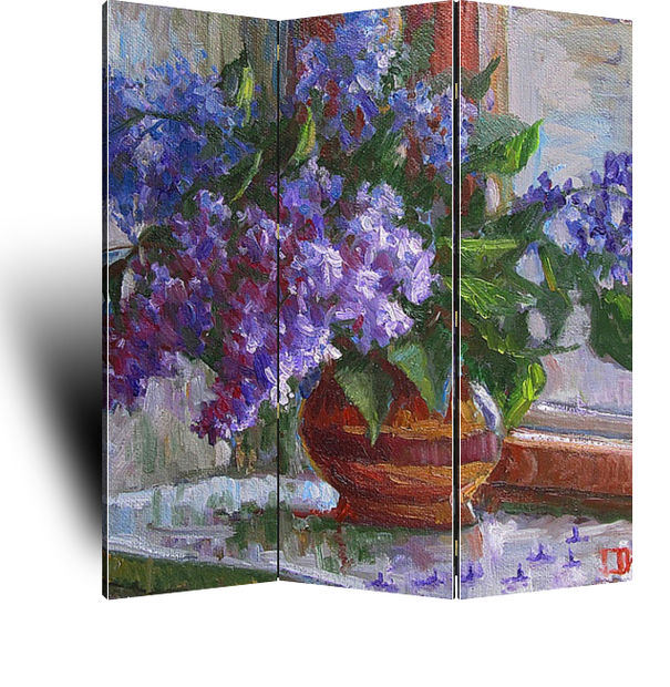 Описание ширмы Это была последняя сирень в этом году, я её еле нашёл, она уже выгорела на солнце и осыпалась (я изобразил осыпавшиеся лепестки сирени на подоконнике)