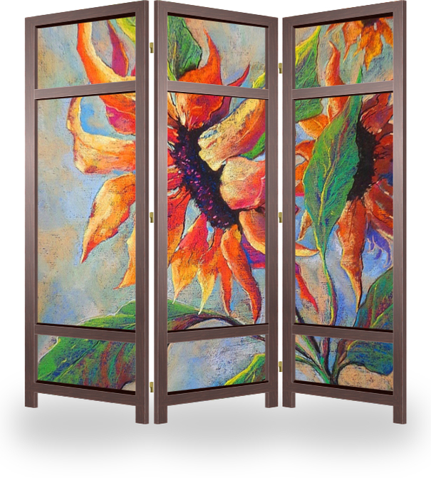 Описание ширмы Картина "Три подсолнуха." (Французский подарок.) размер работы 55х45 см, 2014 год (материалы: картон, темпера, пастель, закрепитель, лак) Пишу картины с раннего детства, очень люблю акварель, но редко удаётся делать акварелью картины, мало времени..