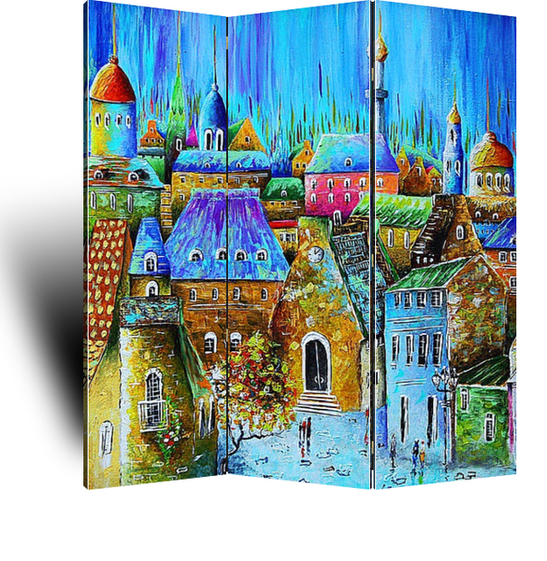 Описание ширмы Этот город - средоточье древности. Улочки - века, переулки - столетия... Брожу, дивлюсь, не ведая лености. Он небольшой. Жителей не наберется и тыщ пятьсот... Утром встает в лучах солнца алых. Встает, просыпается город - сказка. Дворцов тут н