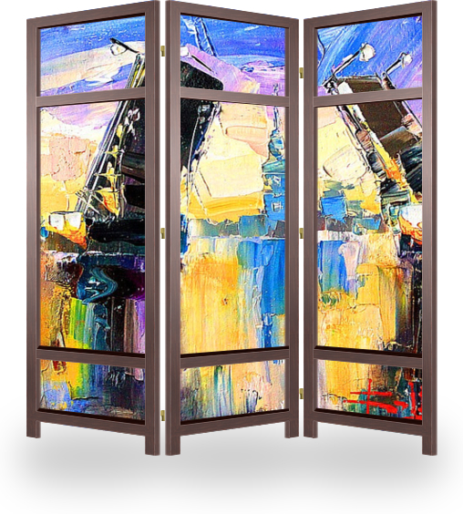 Описание ширмы Картина из серии "В дождь и после" написана художником Константином Сухоплюевым. Сам художник Родился и вырос в Санкт-Петербурге. С ранних лет ему знаком запах масляных красок, он постоянно находился в художественных кругах, поскольку отец Константин