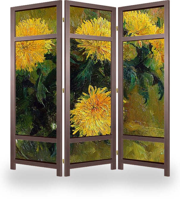 Описание ширмы Натюрморт написанный масляными красками в стиле реализма. Желтые хризантемы- главные герои натюрморта. Задача художника состояла в том, чтобы передать их желтый огонь.
