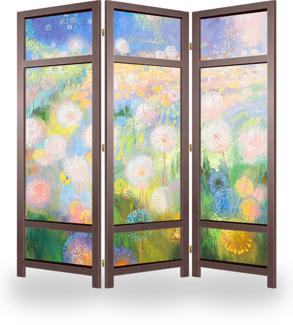 Описание ширмы весной появляются первые цветы-пушистые желтые и белые шарики-одуванчики. голубые тени ложатся на изумрудно -зелёный луг ,дует лёгкий сиреневый ветерок,проснувшаяся после зимнего сна земля просыпается, и все оживает вокруг разноцветьем многотравья ,п