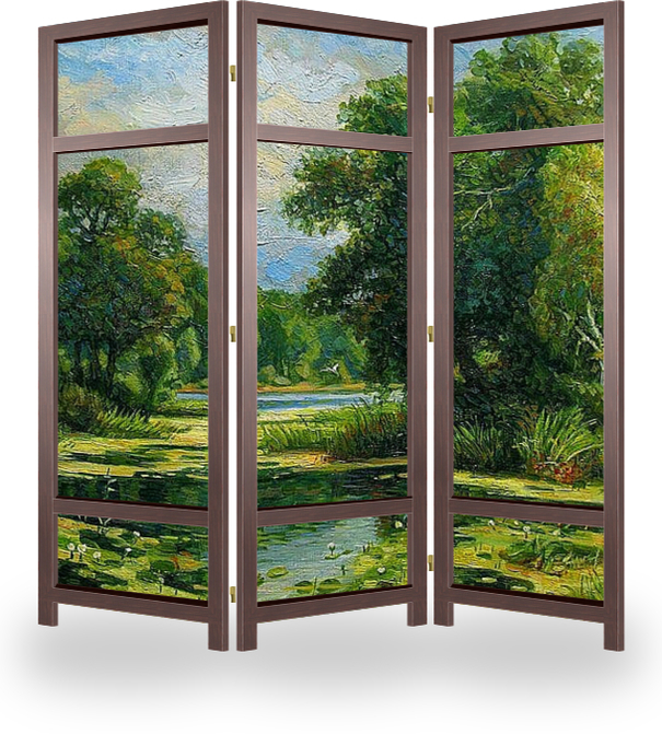 Описание ширмы Озеро в лесу было найдено мною во время прогулки. Вокруг был покой и тишина, который нарушали лишь пение птиц. Набросок для картины была сделан буквально за пару часов.