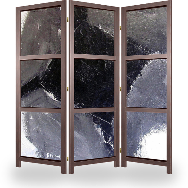 Описание ширмы абстрактная композиция на квадратном холсте, выполненная акриловыми красками в черно-белой гамме, использование геометрической фигуры обусловлено началом триптиха с одноименным названием