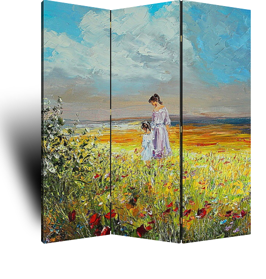Описание ширмы Самое прекрасное в мире наверное наблюдать как мама вместе с ребенком проводят время, именно такую картину захотелось написать после поездки в деревню к родителям. Там я наблюдал за своей семей:они гуляли на лугу среди цветов, резвилась дочка,просто