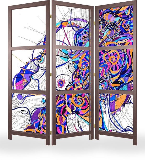 Описание ширмы Картина написана в 2015 году в стиле графика. Она изображает духовное единство двух женщин, это единство показано в виде вьющихся локонов. Эта картина так же о космическом пространстве внутри человека.