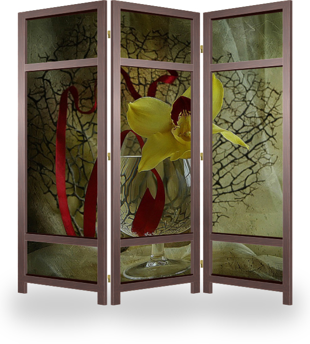 Описание ширмы В нашем парке деревья почти облетели, И сердце заходится в смутной печали… А твои орхидеи в хрустальном бокале Стоят как живые почти две недели – Еще не завяли… Одинокая осень в извечной печали Беспородной дворнягой скулит у порога И отчаянно