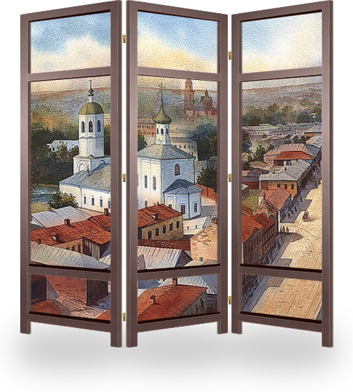Описание ширмы Акварель из серии "Тула ушедшего века". Работа выполнена на основе старых тульских открыток начала 20 века. Большинство архитектурных построек не дошло до наших дней.
