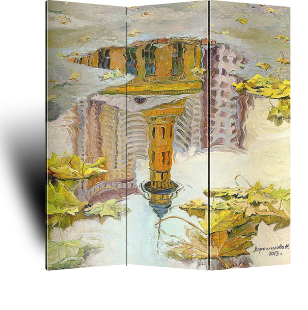 Описание ширмы Картина входит в серию работ "Отражения", написанную по впечатлению от поездки в Амстердам. Каналы, отражающиеся в них дома и люди, натолкнули меня на мысль о создании серии картин, в которых главным героем будет зыбкий мир отражения на тонкой грани