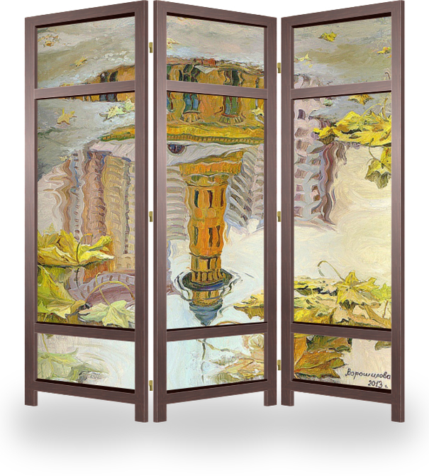 Описание ширмы Картина входит в серию работ "Отражения", написанную по впечатлению от поездки в Амстердам. Каналы, отражающиеся в них дома и люди, натолкнули меня на мысль о создании серии картин, в которых главным героем будет зыбкий мир отражения на тонкой грани