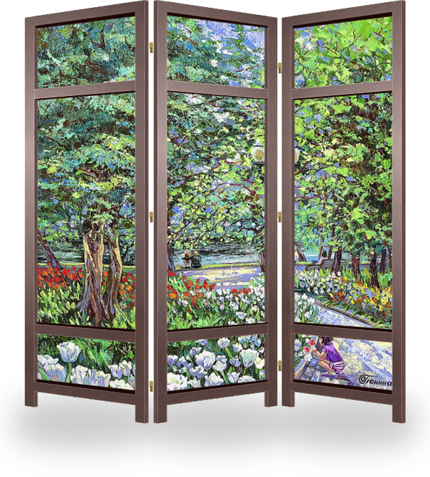 Описание ширмы Весенний день на бульваре Чистые Пруды! Это в основном сохранившаяся старая Москва, которую так любят москвичи за уют и старомодную архитектуру… и это излюбленное место прогулок в центре Москвы. Можно пройтись по Чистопрудному бульвару, посидеть на