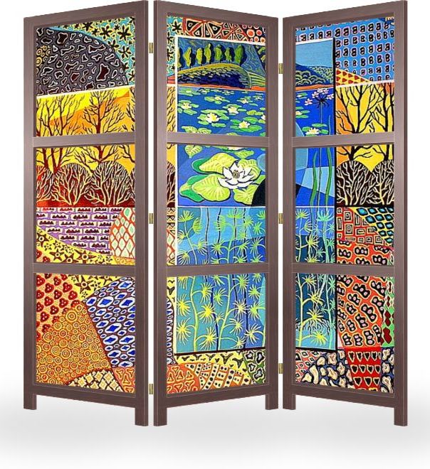 Описание ширмы Ряд работ, написанных мною, я создаю в манере ассоциативной живописи. Для этого достаточно набросать на полотно несколько или множество хаотичных линий, а затем фантазия и воображение доработают сюжет картины.
