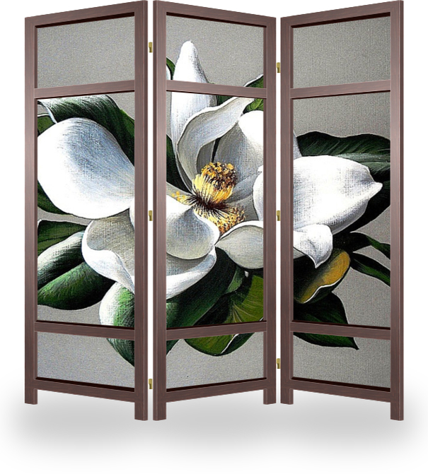 Описание ширмы Когда магнолии цветут, Сердца влюбленных воспылают. Огнем любви, надежды и всегда. Их пыл в итоге побеждает. Когда магнолия цветет, И дева цвет ее увидит. Пора замужества придет. Так, как поверье древнее предвидит.