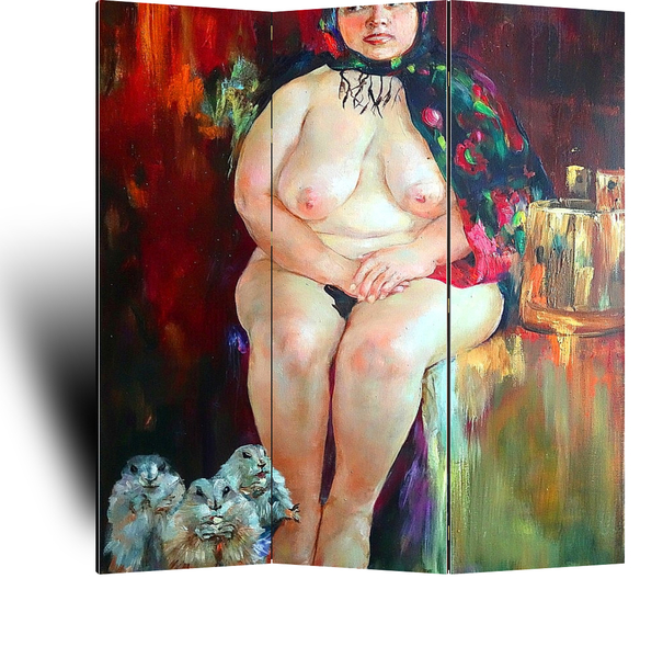 Описание ширмы Картина написана на холсте и необычная ситуация на ней призвана повеселить компанию, возможно в бане или бассейне. Колоритность фигуры и Яркость заднего фона создают впечатление притягивающего взгляды приключения.