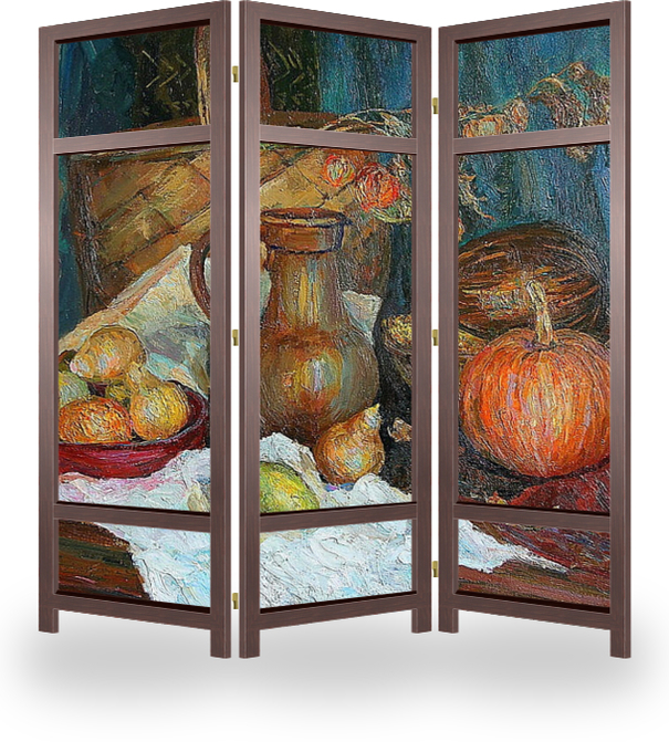 Описание ширмы Автор - знаменитый художник Д.В. Ревякин. Картина - живописное полотно на холсте, написана масляными красками с натуры. Яркие цвета указывают на индивидуальный подчерк художника.