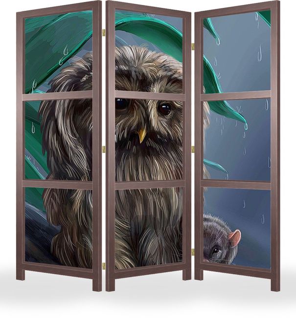 Описание ширмы Грустная сова неясыть и маленький мышонок прячутся в лесу под листьями от дождя. Рисунок выполнен в программе пэинт тутол саи. Общая цветовая гамма серая.