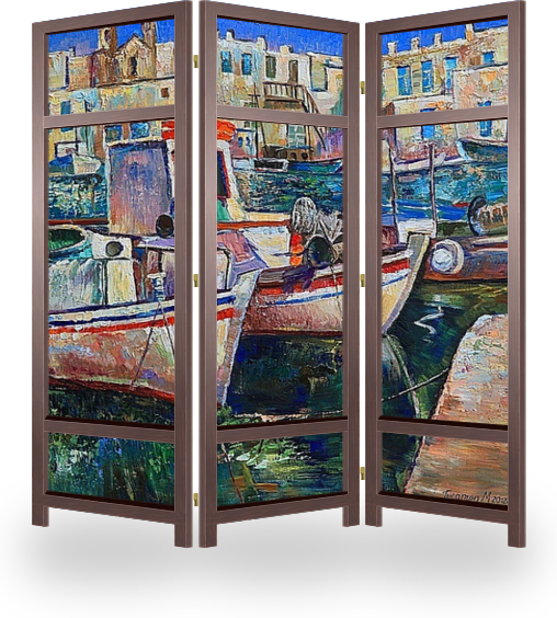 Описание ширмы Белоснежные дома, рыбацкие лодки с сетями на фоне голубого неба, православные храмы - всё это Греция. Живописные скалы, заросшие средиземноморской растительностью - завораживают и восхищают. Греция вдохновляет.