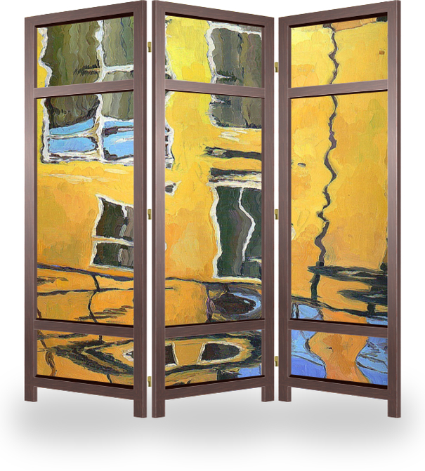 Описание ширмы Картина входит в серию работ "Отражения", написанную по впечатлению от поездки в Амстердам. Каналы, отражающиеся в них дома и люди, натолкнули меня на мысль о создании серии картин, в которых главным героем будет зыбкий мир отражения на тонкой грани