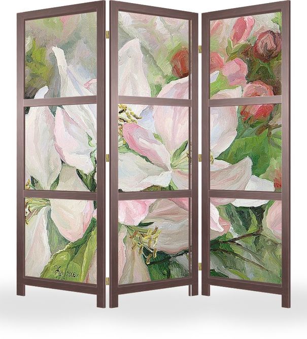 Описание ширмы Картина "Яблоня", холст, масло, 70х70 см. Написана под впечатлением от цветения яблонь. Хотелось передать нежность каждого лепестка, сохранить ощущение весны на картине. Цветы изображены очень крупно, они как будто не вмещаются в размер холста, а стр