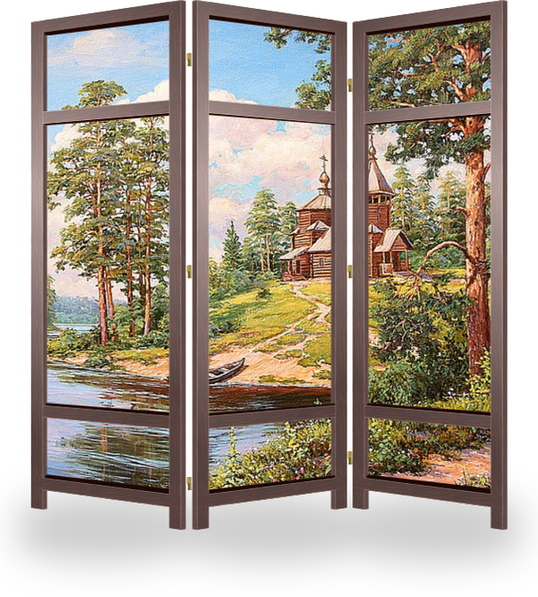 Описание ширмы Автор Олейник Алик, холст масло, размер 45 х 65 см, написана в августе 2015 года, на картине изображена деревянная церковь 19 века на взгорке возле реки, место в реальности не существует, это творческий замысел автора.