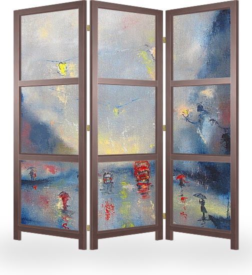 Описание ширмы Картина с изображением городского пейзажа, людей с зонтиками, и машинок в дождь в технике холст/масло. "Под дождем". Картина хорошо впишется в интерьер гостиной квартиры или загородного дома