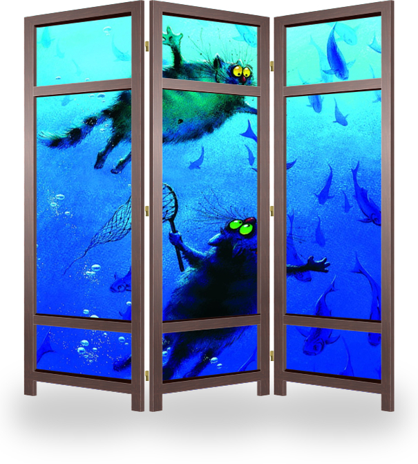 Описание ширмы Вольная фантазия на тему котиков и рыбы. Два синих кота ловят рыбу прямо в морской пучине. Весёлый задор и богатый улов. "Если б кошки были рыбками..."