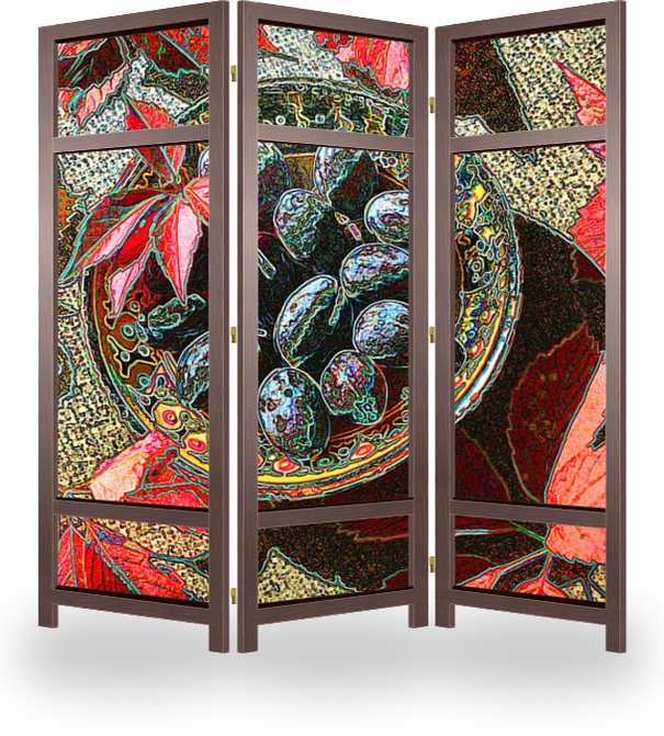 Описание ширмы Натюрморт снят в солнечный осенний день на даче. Виноградные листья уже покрыты глубоким багрянцем. Сливы в цветной керамической вазе являются центром всей композиции.