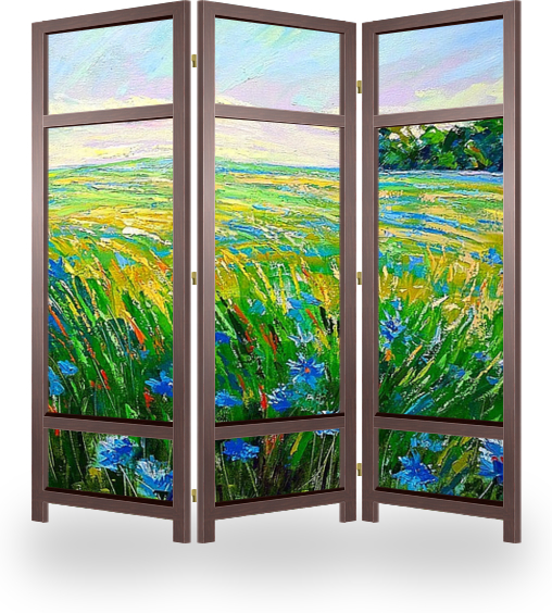 Описание ширмы пленерная работа, выполнена в ипресионистической манере пастозной техникой наложения света, под впечатлением солнечного света золивающего луг, и освещающего в дали деревья. Передний план с яркими цветами создают контрастный эфект на траве.