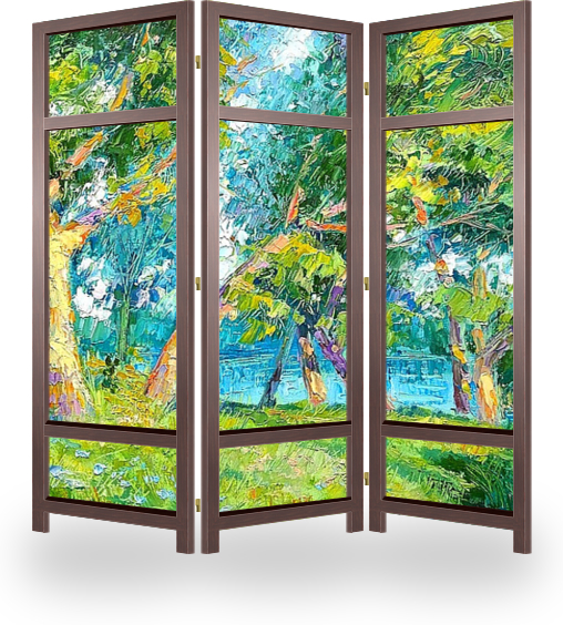 Описание ширмы пленерная работа, выполнена в ипресионистической манере пастозной техникой наложения света, под впечатлением вечернего солнечного света, освещающего, деревья, их стволы.Красивый тёплый свет на стволах деревьев эффектно контрастирует с холодными оттен