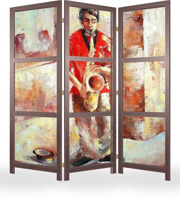 Описание ширмы На улице пустынной музыкант и саксофон в руках, как птица, бьётся и кажется не звуки, а душа возвышенно над городом несётся. Автор: Валентина Силава Этот юный музыкант играл на улочках Берлина и остановившись я простояла долго слушая потрясающу