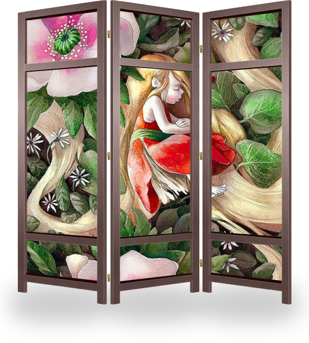 Описание ширмы Акварельная работа. В летнее солнечное утро Вы направляетесь в полисадничек, нарвать цветов, раздвигаете маки, а там - спящая крошечная девочка в платье из красных лепестков с длиннююююююююююющими светлыми волосами