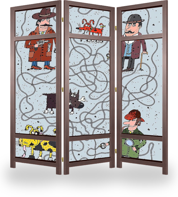 Описание ширмы Рисунок-загадка для развития внимания у детей. На картинке изображены известные детективы со своими служебными собаками. Собаки так запутали поводки, что сыщики теперь сами не могут разобраться, где чей пёс. Постер с этой картинкой можно подарить р