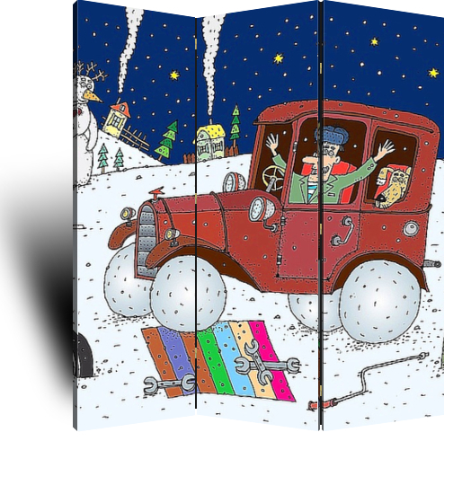 Описание ширмы Зимняя ночь. Идёт снег. Cнеговик помог отремонтировать старый автомобиль, заменив летние шины на зимние. Водитель и его собака очень довольны. Они уже заказали себе эти постеры на память о необычном приключении.