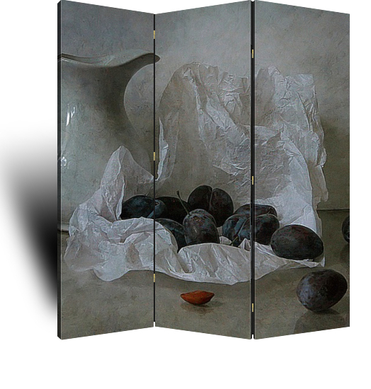 Описание ширмы Натюрморт Сливы с кувшином прекрасно подходит как аксессуар интерьера, дополнит любой дизайн Вашей кухни и столовой. Фотонатюрморт - стильный, уникальный и необычный подарок.