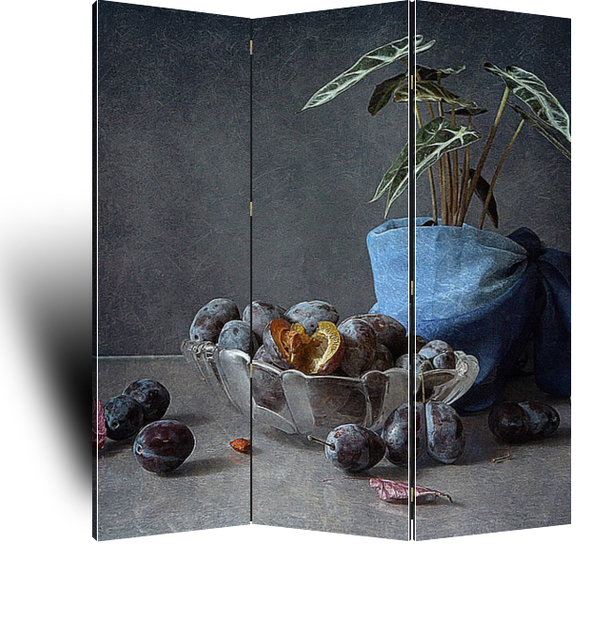 Описание ширмы Натюрморт Сливы с алоказией прекрасно подходит как аксессуар интерьера, дополнит любой дизайн Вашего дома. Фотонатюрморт - стильный, уникальный и необычный подарок.