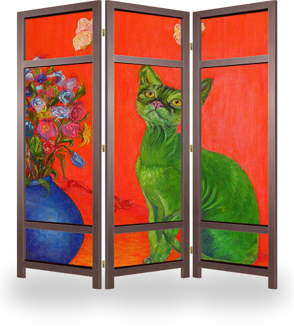 Описание ширмы На картине кошка породы сфинкс, наблюдающая за бабочками. Я её изобразила зелёной, потому, что такой вижу её суть, её характер. Картина выполнена в смешанной технике (акрил, масло) на холсте.