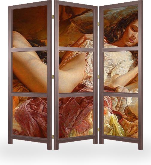 Описание ширмы Молодая темноволосая девушка в белой полупрозрачной сорочке, дремлет, освещённая солнечным светом, на красиво смятой постели. Её волосы разметались, а черты лица безмятежны.