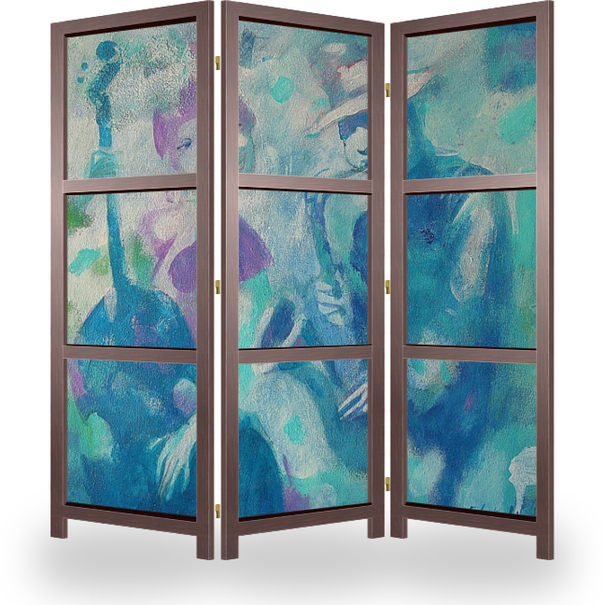 Описание ширмы Музыка. Серебристо-фиолетовый колорит... Джазовая импровизация. Флирт. Динамика поз музыкантов. Саксофон и контрабас. Ритм и мелодия. Дуэт. Он и она...