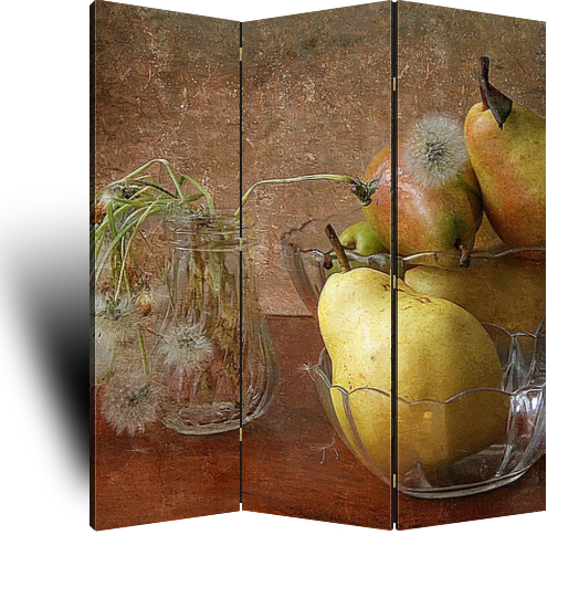 Описание ширмы Воздух предутренний, как бирюза, Словно стерильный, хмельной еле-еле... И одуванчик расцвёл на глазах, Словно весной... Нас качают качели... Тайные игры во сне, наяву, С нами затеяла память и всё же, Помнишь, созрел виноград к торжеству... Вечер далё