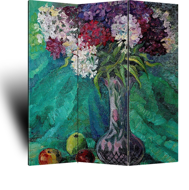 Описание ширмы натюрморт в стиле русских импрессионистов - яркие, сочные краски, почти открытый зеленый цвет драпировки и затемненный фон с ярковыраженными на нем цветами пестрых флоксов, яркими яблоками и резкими тенями