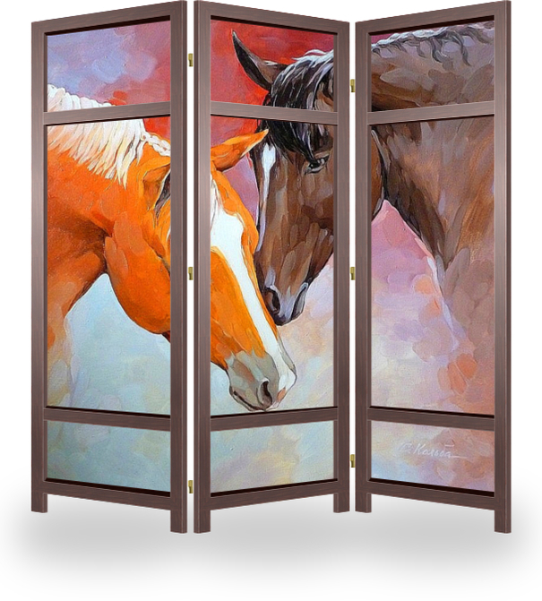 Описание ширмы картина написана маслом на холсте, размер подрамника 60 х 60 см. На картине изображена пара красивых лошадей. Эта картина украсит интерьер спальной комнаты.