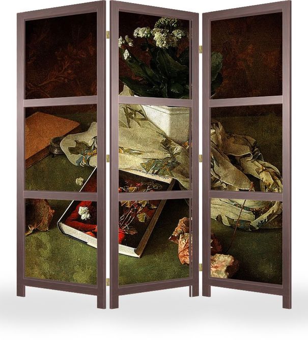 Описание ширмы Натюрморт Перечитывая Гёте прекрасно подходит как аксессуар интерьера, дополнит любой дизайн Вашего дома. Фото натюрморт - стильный, уникальный и необычный подарок.