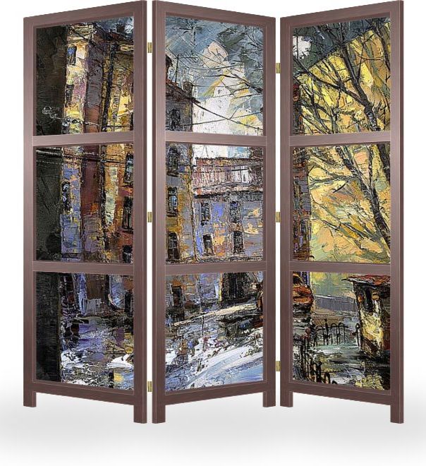 Описание ширмы Петроградские дворики, душевное состояние их невольно трогают душу художника своей уникальной простатой, уединением и архитектурой. Дворик на Ул.Подрезова 14, это бывшее здание церкви Казанской Божией Матери подворья Вышневолодцкого монастыря, перест