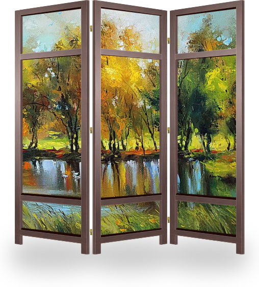 Описание ширмы Картина маслом на холсте "Местечко в Калмаше". Размер 40x60 см. Живопись выполнена Светланой Рогозиной в 2015 году. Картина выполнена в колорите цвета охры. Зеркальное отражение воды.