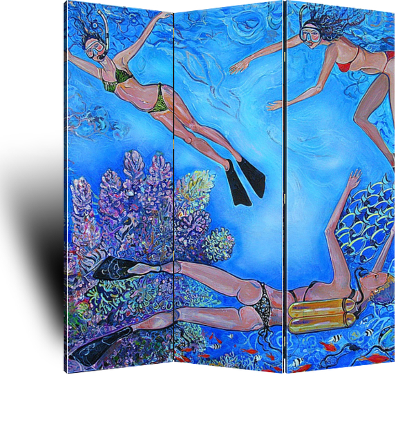 Описание ширмы ДЕВУШКИ-РЫБЫ 2011. Холст, акрил. 70*80 см Идея этой картины пришла ко мне внезапно, в Египте, в дайвинг-центре, где выдавались акваланги. Страсть к погружению в морские пучины - своего рода бегство от действительности, возможность быть другим и а