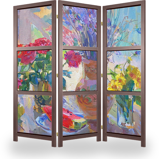 Описание ширмы Натюрморт был написан в 2015 году на летнем пленэре на Тарханкуте, пос. Мариьино, дача В.И.Толочко, крымского живописца, пейзажиста, мастера тематической картины.