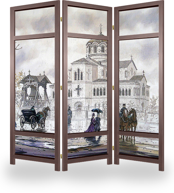 Описание ширмы Одна из картин серии "Старый город" севастопольского художника Костромы Геннадия Николаевича. Отражает быт Севастополя конца XIX века. На картине изображён Владимирский кафедральный Собор в Херсонесе. Построен в 1876.