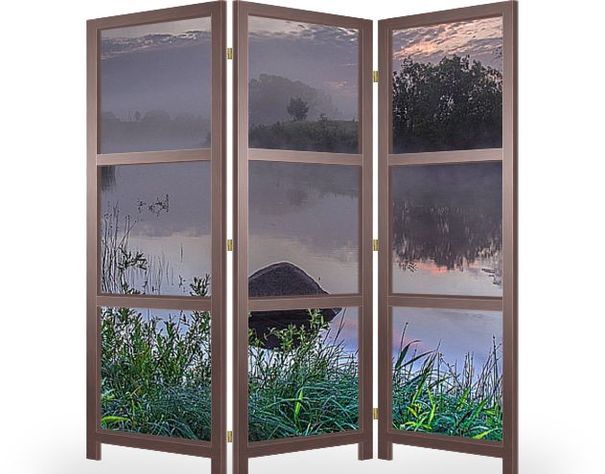 Описание ширмы Река окутана туманом, На травы выпала роса. Срезает стебли утром рано, Как бритва острая коса. Ложатся травы, умирая И выделяя сладкий сок. Июльским утром тихим, ранним, Когда раскрасился Восток.