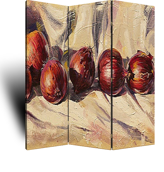 Описание ширмы Эта картина писалась в 7 утра, при восходящем солнце, в начале сентября. Яркое освещение, глубокие тени, рельефные мазки, и сочные тёплые осенние красные луковицы. Пусть эта картина украсит Вашу кухню и напомнит о светлой и теплой осени.
